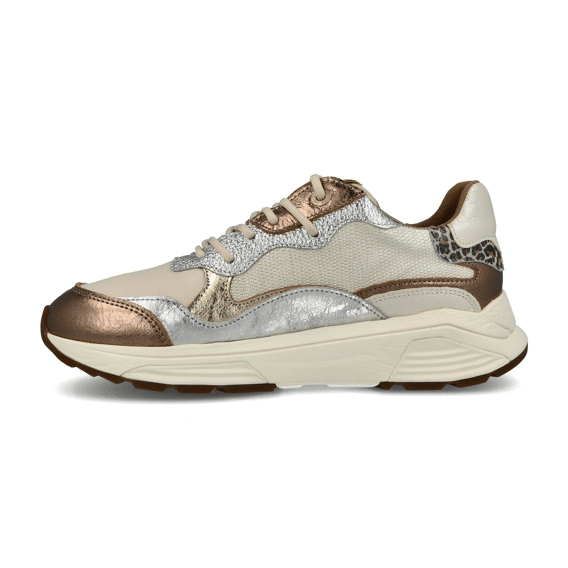 Deze nieuwe sneaker uit de collecite Next Generation heeft een vrouwelijke en speelse uitstraling. Het afgeronde silhouet in combinatie met gebogen appliqués roept associaties op met de Rainbow Bridge bij de Niagara Falls. Hoogwaardige materialen, waaronder glad, metallic en suèdeleer, worden op een kleurrijke manier gecombineerd. Stretchleer en zachte kussentjes zorgen voor optimaal comfort.